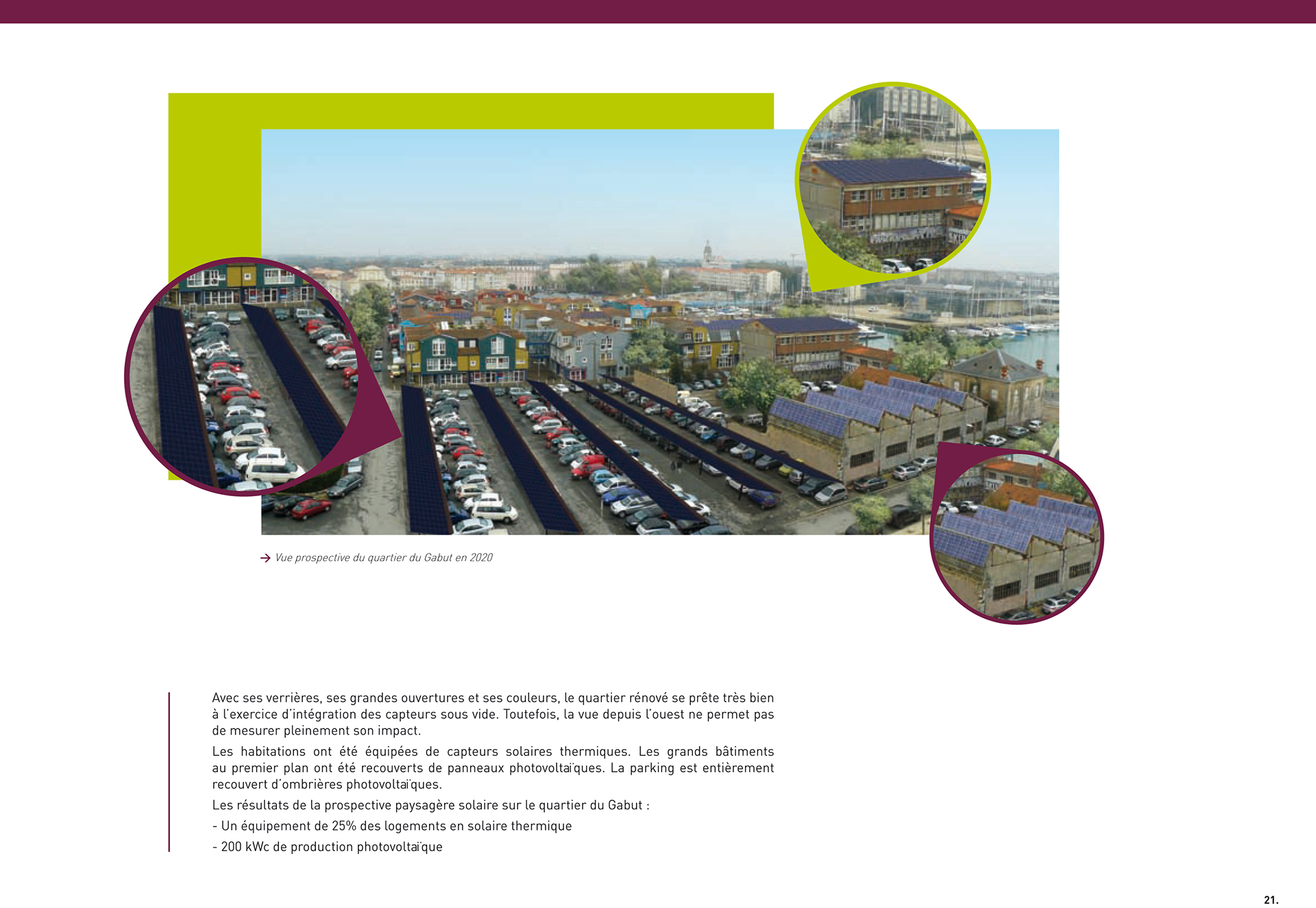Réaliser et mettre en page un guide à destination des professionnels du secteur. Ce guide se voudra aéré afin de mettre en avant des schémas de composition, des exemples d'installations de capteurs ainsi que des prospectives paysagères solaires.