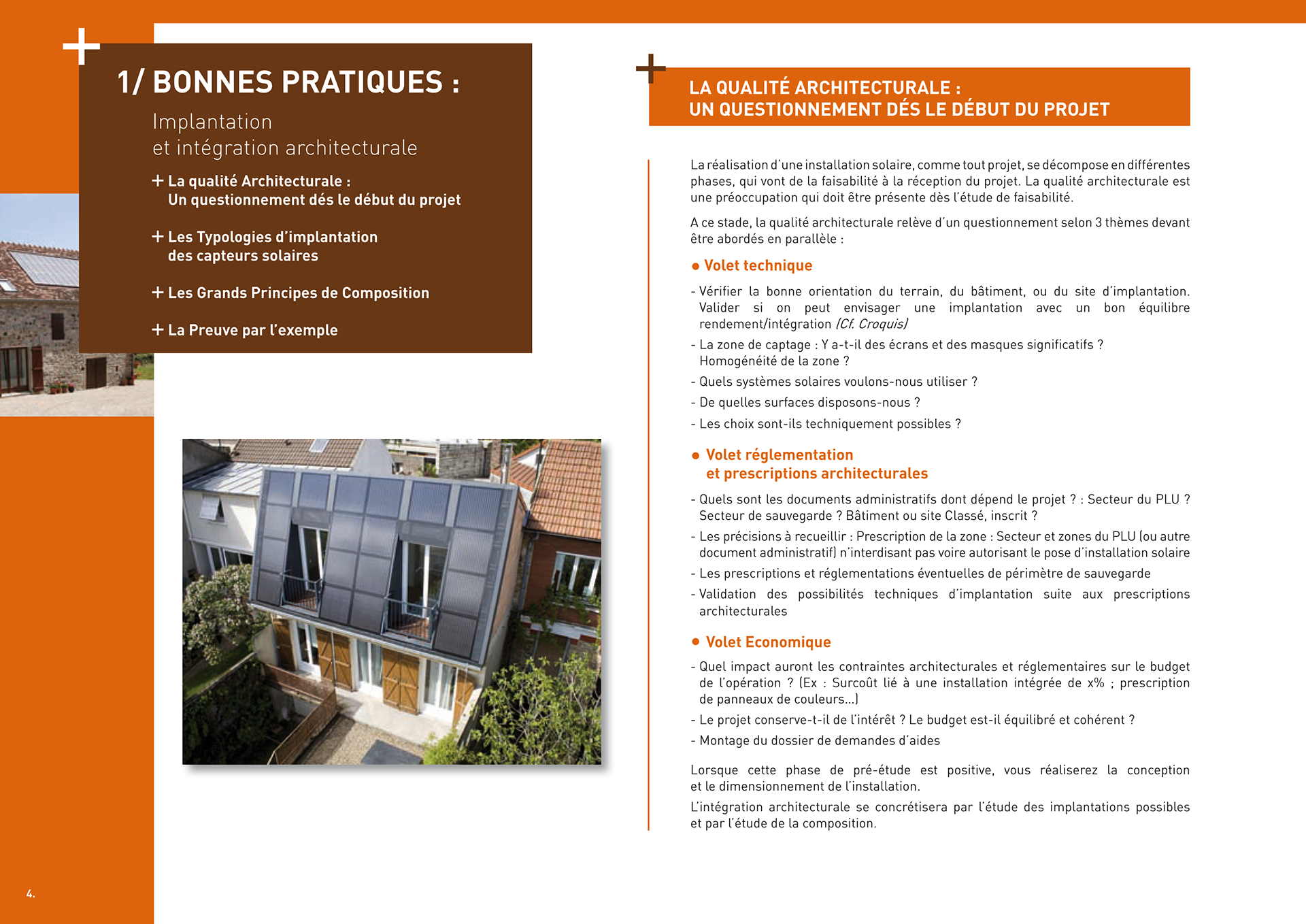 Dans le cadre des objectifs 2020 fixés par l'Europe et du Grenelle de l'Environnement, le syndicat de l'énergie solaire renouvelable, Enerplan, soutenu par l'Ademe, a souhaité diffuser un guide d'intégration architecturale des capteurs solaires à destination des professionnels du secteur.